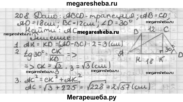 208 В равнобокой трапеции ABCD основания AD и ВС равны соответственно 18 см и 12 см, а боковая сторона образует с основанием AD угол 30°. Найдите диагональ трапеции.