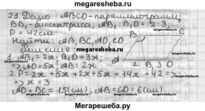 21. Биссектриса угла В параллелограмма ABCD делит сторону AD в отношении 2:3, считая от вершины угла А. Найдите стороны параллелограмма, если его периметр равен 42 см.