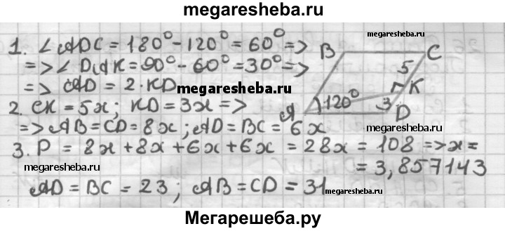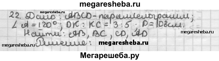 22. В параллелограмме ABCD угол А равен 120°. Высота АК делит сторону CD в отношении 3:5, считая от вершины тупого угла. Найдите стороны параллелограмма, если его периметр равен 108 см