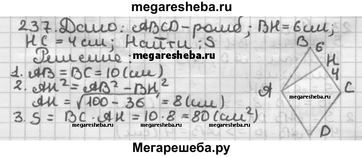 237. Высота, проведённая из вершины тупого угла ромба, делит сторону на отрезки длиной 6 см и 4 см, считая от вершины острого угла. Найдите площадь ромба.