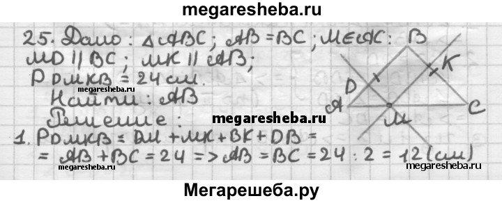 25. На основании равнобедренного треугольника отмечена произвольная точка и через неё проведены прямые, параллельные его боковым сторонам. Периметр полученного параллелограмма равен 24 см. Найдите боковую сторону треугольника.