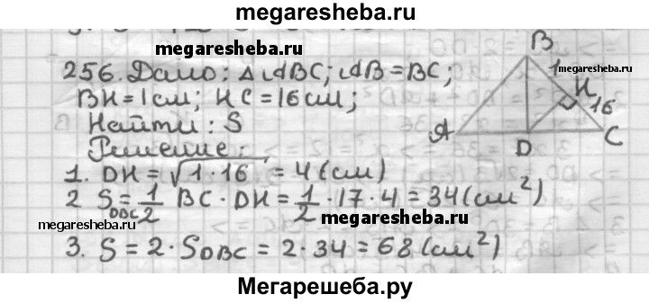 256. Перпендикуляр, проведённый из середины основания равнобедренного треугольника к боковой стороне, делит её на отрезки длиной 1 см и 16 см. Найдите площадь треугольника.