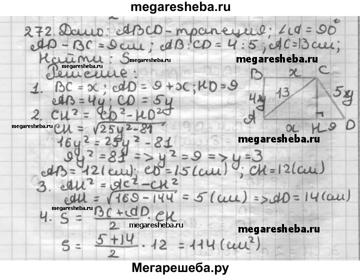272. Разность оснований прямоугольной трапеции равна 9 см, а её боковые стороны относятся как 4 : 5. Найдите площадь трапеции, если её меньшая диагональ равна 13 см.