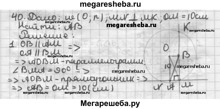 40. В окружности проведены перпендикулярные хорды MN и МК. Расстояние от центра окружности до точки М равно 10 см. Найдите длину отрезка, соединяющего середины хорд.