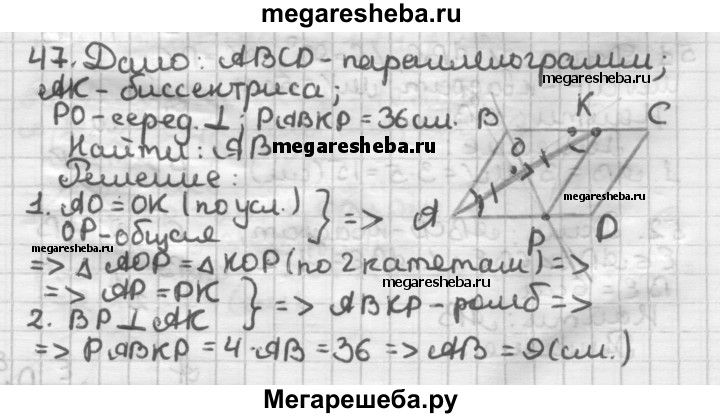 47. Биссектриса угла А параллелограмма ABCD пересекает сторону ВС в точке К. Серединный перпендикуляр отрезка АК пересекает сторону AD в точке Р. Найдите сторону АВ, если периметр четырёхугольника АВКР равен 36 см.
