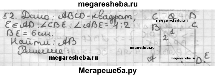 52. На продолжении стороны AD квадрата ABCD за точку D отметили точку Е такую, что луч BE делит угол АВС в отношении 1 : 2. Найдите сторону квадрата, если BE = б см