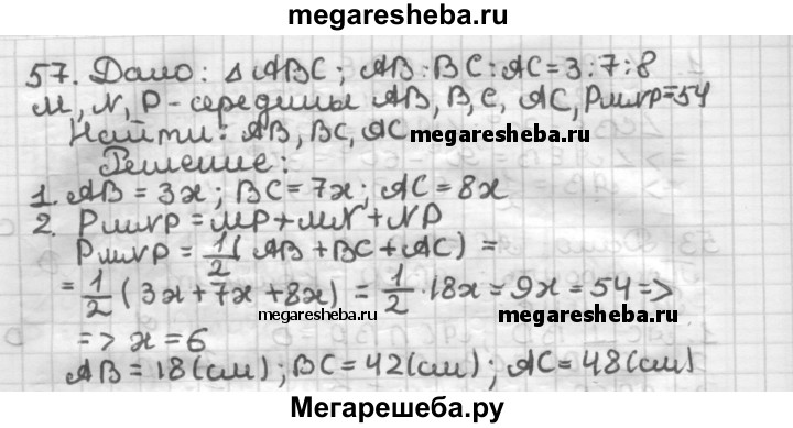 57. Периметр треугольника, вершины которого — середины сторон данного треугольника, равен 54 см, а стороны данного треугольника относятся как 3:7:8. Найдите стороны данного треугольника.