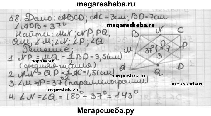 58. Диагонали четырёхугольника равны 3 см и 7 см, а угол между ними — 37 . Найдите стороны и углы четырёхугольника, вершинами которого являются середины сторон данного четырёхугольника.