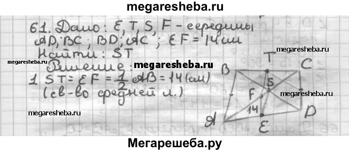 61. Точки Е, Т, Fn S — середины сторон AD и ВС и диагоналей АС и BD четырёхугольника ABCD соответственно. Найдите сторону ST четырёхугольника EFTS, если EF = 14 см.