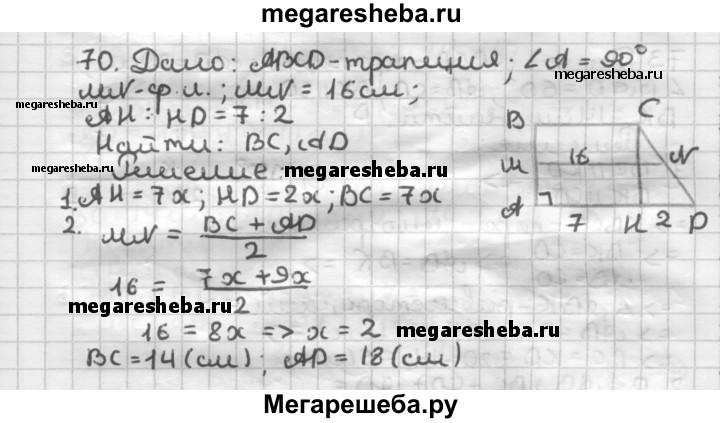70. Средняя линия прямоугольной трапеции равна 16 см, а её высота, проведённая из вершины тупого угла, делит основание в отношении 7:2, считая от вершины прямого угла. Найдите основания трапеции.