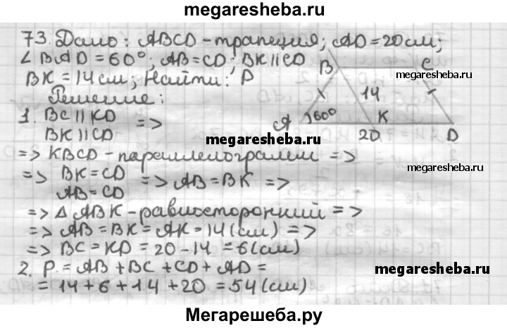 73. В равнобокой трапеции ABCD большее основание AD равно 20 см, ∠BAD = 60°. Через вершину В трапеции проведена прямая, параллельная стороне CD и пересекающая сторону AD в точке К. Найдите периметр трапеции, если ВК = 14 см.