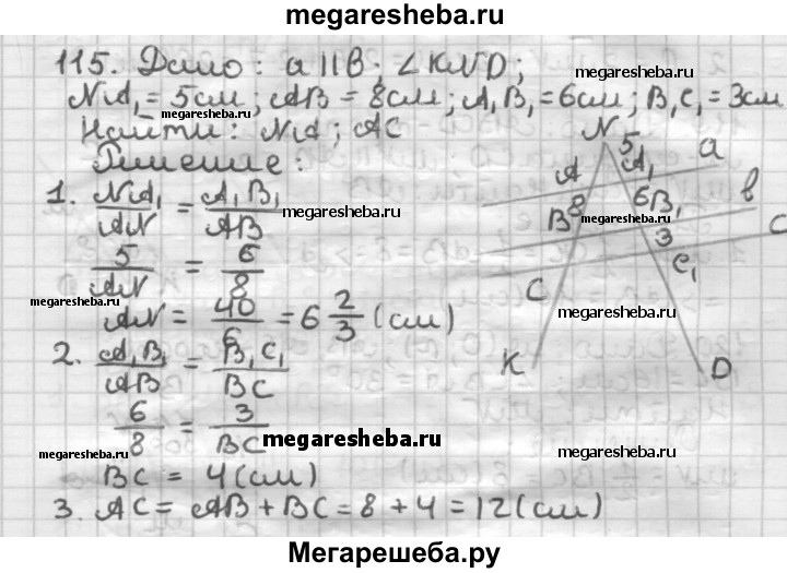 115. Параллельным епересекаю е прястороны уг- ла KND (рис. 101). Найдите отрезки NA и АС, если NA1 = 5 см, АВ = 8 см, А1В1 = 6 см, В1С1 = 3 см.