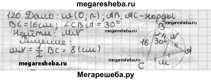 120. В окружности проведены хорды АВ и АС. Расстояние между точками В и С равно 16 см. Найдите расстояние от середины хорды АС до хорды АВ, если ∠CBA = 30°.