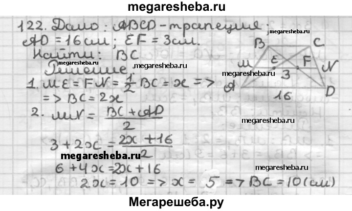 122. Большее основание трапеции равно 16 см. Диагонали трапеции пересекают её среднюю линию в точках Е и F. Найдите меньшее основание трапеции, если EF = 3 см.