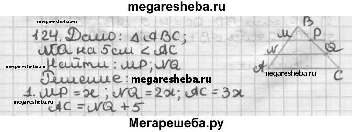124. Сторону ВС треугольника АВС разделили на 3 равных отрезка и через точки деления провели прямые, параллельные стороне АС. Найдите отрезки этих прямых, принадлежащие треугольнику АВС, если наибольший из этих отрезков на 5 см меньше стороны АС.