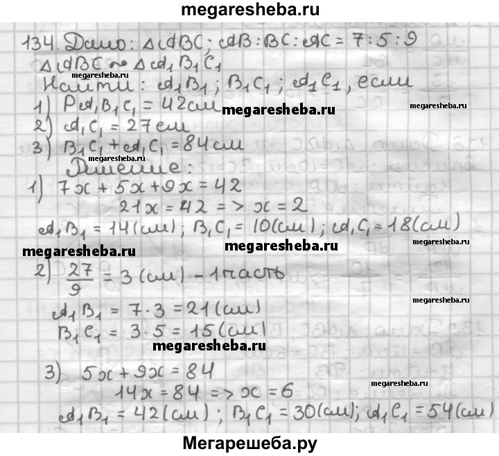 134. Стороны треугольника относятся как 7:5:9. Найдите стороны подобного ему треугольника, если: 1) его периметр равен 42 см; 2) его наибольшая сторона равна 27 см; 3) сумма его наибольшей и наименьшей сторон равна 84 см.