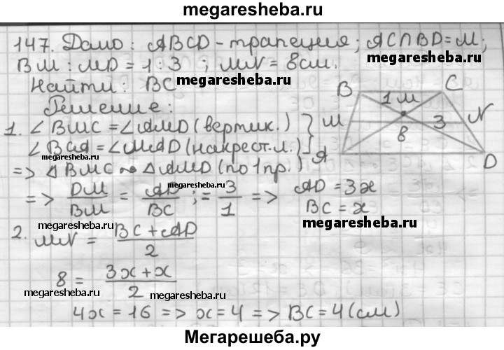147. В трапеции ABCD (ВС || AD) М — точка пересечения диагоналей, ВМ : MD =1:3. Найдите меньшее основание трапеции, если её средняя линия равна 8 см.