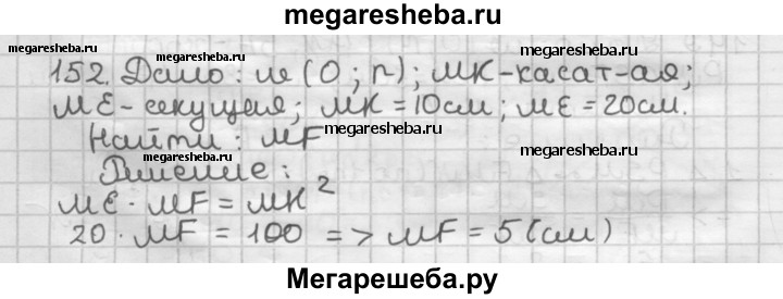 152. Через точку М проведены к окружности касательная МК (К — точка касания) и секущая ME, пересекающая окружность в точках Е и F (рис. 109). Найдите отрезок MF, если МК - 10 см, ME =20 см.