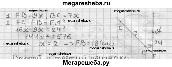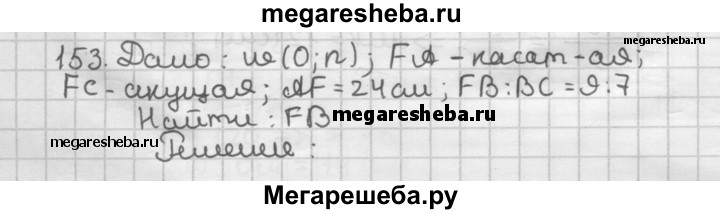 153. Через точку F проведены к окружности касательная FA (А — точка касания) и секущая, пересекающая окружность в точках В и С (точка В лежит между точками F и С). Найдите отрезок FB, если AF= 24 см и FB : ВС = 9 : 7.