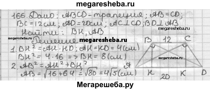 166. Найдите высоту и боковую сторону равнобокой трапеции, основания которой равны 12 см и 20 см, а диагонали перпендикулярны боковым сторонам.