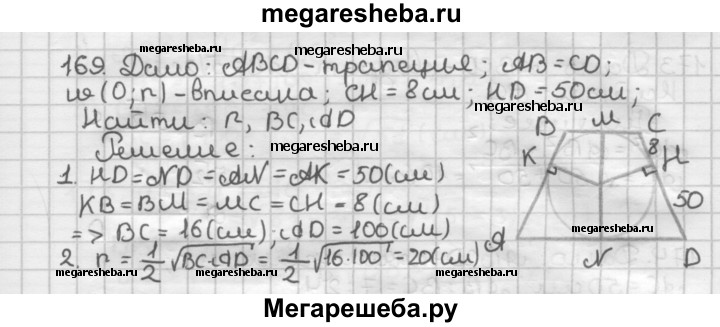 169. Точка касания окружности, вписанной в равнобокую трапецию, делит боковую сторону на отрезки длиной 8 см и 50 см. Найдите радиус вписанной окружности и основания трапеции.