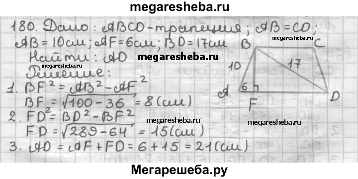 180 В равнобокой трапеции ABCD боковая сторона равна 10 см, а высота BF делит основание AD на отрезки, меньший из которых равен 6 см. Найдите большее основание трапеции, если её диагональ равна 17 см.