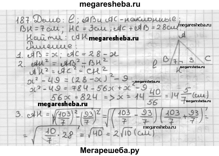 187 Из точки к прямой проведены две наклонные, проекции которых на эту прямую равны 3 см и 7 см. Найдите расстояние от точки до данной прямой, если сумма наклонных равна 28 см.