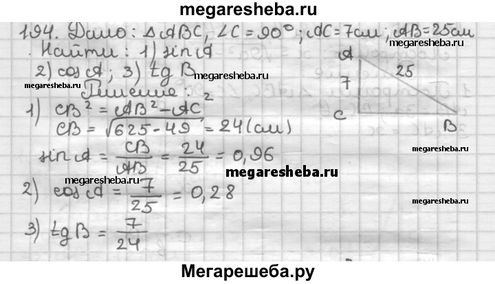 194. Катет и гипотенуза прямоугольного треугольника соответственно равны 7 см и 25 см. Найдите: 1) синус угла, противолежащего большему катету; 2) косинус угла, противолежащего большему катету; 3) тангенс угла, прилежащего к меньшему катету.