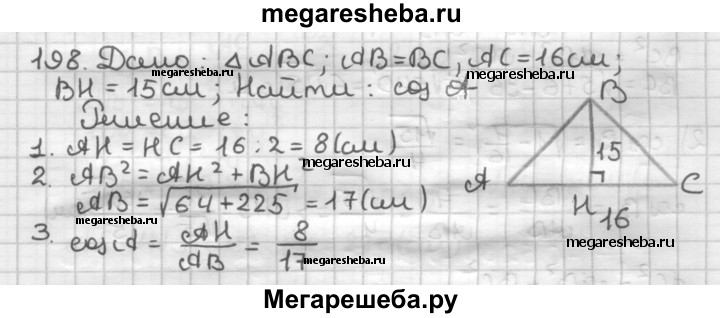 198. Основание равнобедренного треугольника равно 16 см, а высота, проведённая к основанию, — 15 см. Найдите косинус угла при основании треугольника.