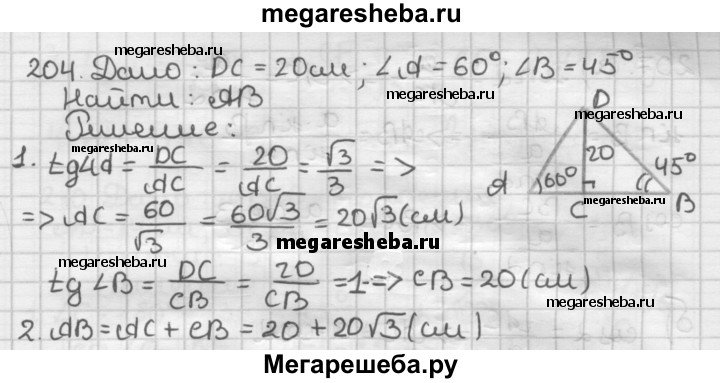 204 Из точки, находящейся на расстоянии 20 см от прямой, проведены две наклонные, образующие с прямой углы 60° и 45°. Найдите расстояние между основаниями наклонных. Сколько решений имеет задача?