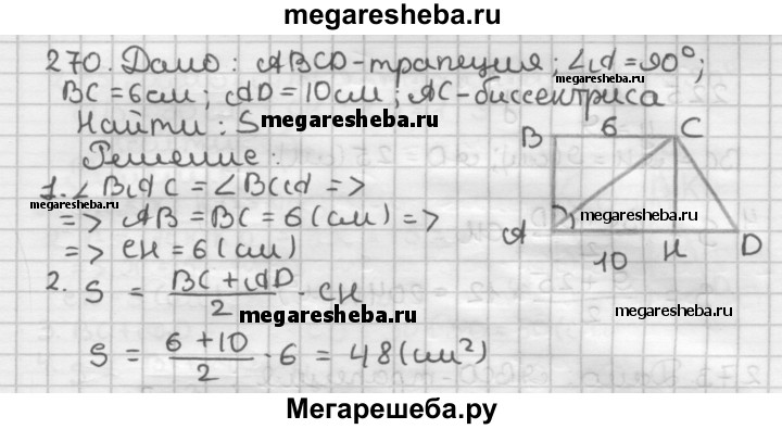 270. Основания прямоугольной трапеции равны 6 см и 10 см. Найдите площадь трапеции, если её меньшая диагональ является биссектрисой прямого угла трапеции.