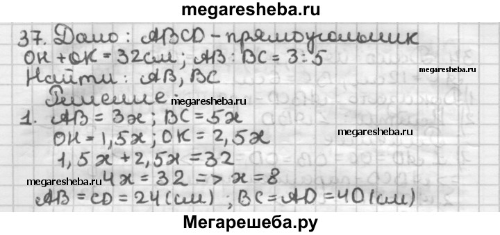 37. Сумма расстояний от точки пересечения диагоналей прямоугольника до его двух соседних сторон равна 32 см. Найдите стороны прямоугольника, если они относятся как 3:5.