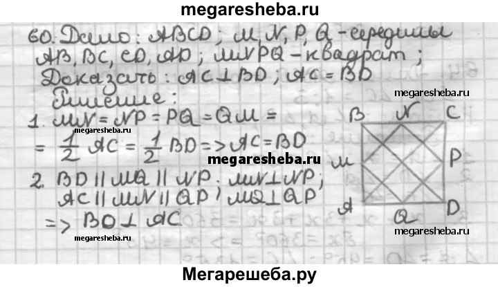 60. Четырёхугольник, вершины которого — середины сторон данного четырёхугольника, является квадратом. Докажите, что диагонали данного четырёхугольника равны и перпендикулярны.