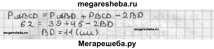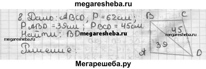8. Периметр четырёхугольника равен 62 см, а периметры треугольников, на которые одна из диагоналей разбивает данный четырёхугольник, равны 39 см и 45 см. Найдите эту диагональ четырёхугольника.