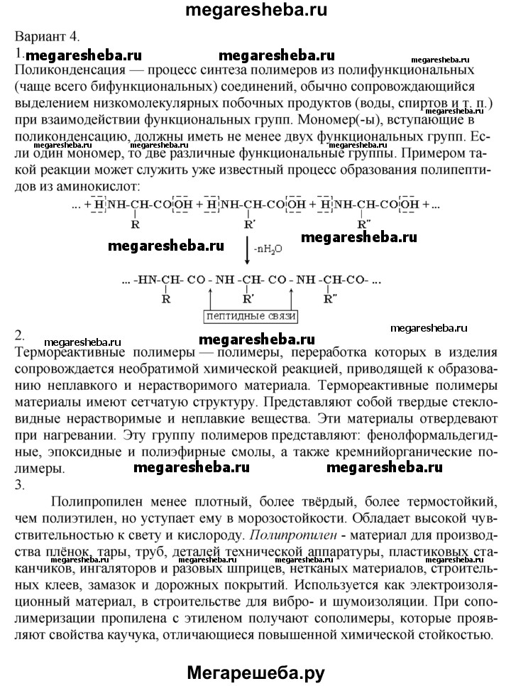 Вариант 4 1. Какой процесс называют поликонденсацией? Какими признаками должны обладать вещества, вступающие в реакцию поликонденсации? Ответ подтвердите конкретным примером. 2. Каковы свойства термореактивных полимеров? 3. Перечислите свойства и области применения полипропилена.