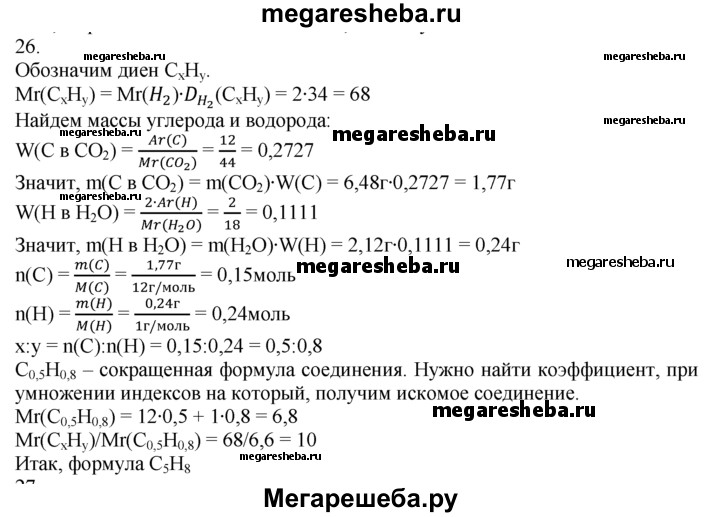 26. Найдите молекулярную формулу алкадиена, если при сжигании 2 г его образовалось 2,12 г воды и 6,48 г оксида углерода(1У). Относительная плотность паров этого вещества по водороду 34. (Ответ: С5Н8.)