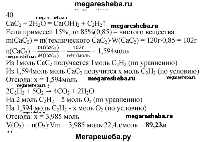 40. Рассчитайте объём кислорода (н. у.), который потребуется для полного сгорания ацетилена, полученного из 120 г карбида кальция, содержащего 15% примесей. {Ответ: 89,25 л.)