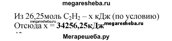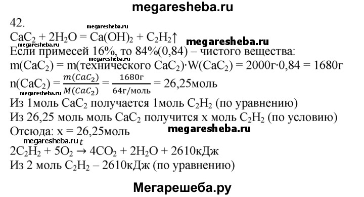 42. Термохимическое уравнение реакции горения ацетилена 2С2Н2 + 502 = 4С02 + 2Н20 + 2610 кДж Рассчитайте количество теплоты, которое выделится при сгорании ацетилена, полученного из 2 кг карбида кальция, содержащего 16% примесей. (Ответ: 34 256,25 кДж.)