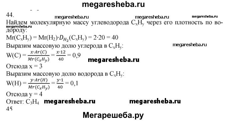 44. Найдите молекулярную формулу алкина, массовая доля углерода в котором составляет 90%. Относительная плотность его по водороду равна 20. (Ответ: С3Н4.)