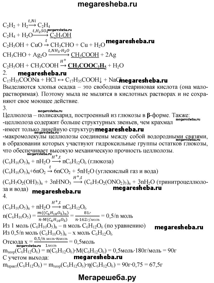 Вариант 2 1. Как из ацетилена получить уксусноэтиловый эфир? Напишите уравнения реакций и укажите условия их протекания. 2. Мыло в кислой среде теряет моющие свойства. Объясните это явление и подтвердите его уравнением реакции. 3. Охарактеризуйте строение и химические свойства целлюлозы. Составьте уравнения соответствующих реакций. Назовите образующиеся вещества. 4. Рассчитайте массу глюкозы, которую можно получить из крахмала массой 81 г, если массовая доля выхода продукта составляет 75%. (Ответ: 67,5 г.)