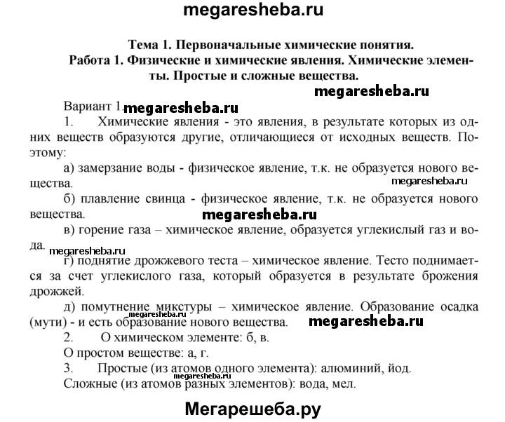 Вариант 1 1. Какие из перечисленных явлений относят к химическим и почему? а) Замерзание воды; б) плавление свинца; в) горение газа; г) поднятие дрожжевого теста; д) помутнение микстуры при длительном хранении. 2. Укажите, в каких предложениях речь идет о простом веществе, а в каких — о химическом элементе. а) Все живые существа на Земле дышат кислородом. б) В состав ржавчины входят железо и кислород. в) На долю кислорода в воде приходится 89%. г) Железо притягивается магнитом. 3. Укажите, какие из перечисленных веществ являются простыми, а какие — сложными. Поясните свой выбор. а) Вода Н2О; б) алюминий Аl; в) иод l2; г) мел СаСO3.