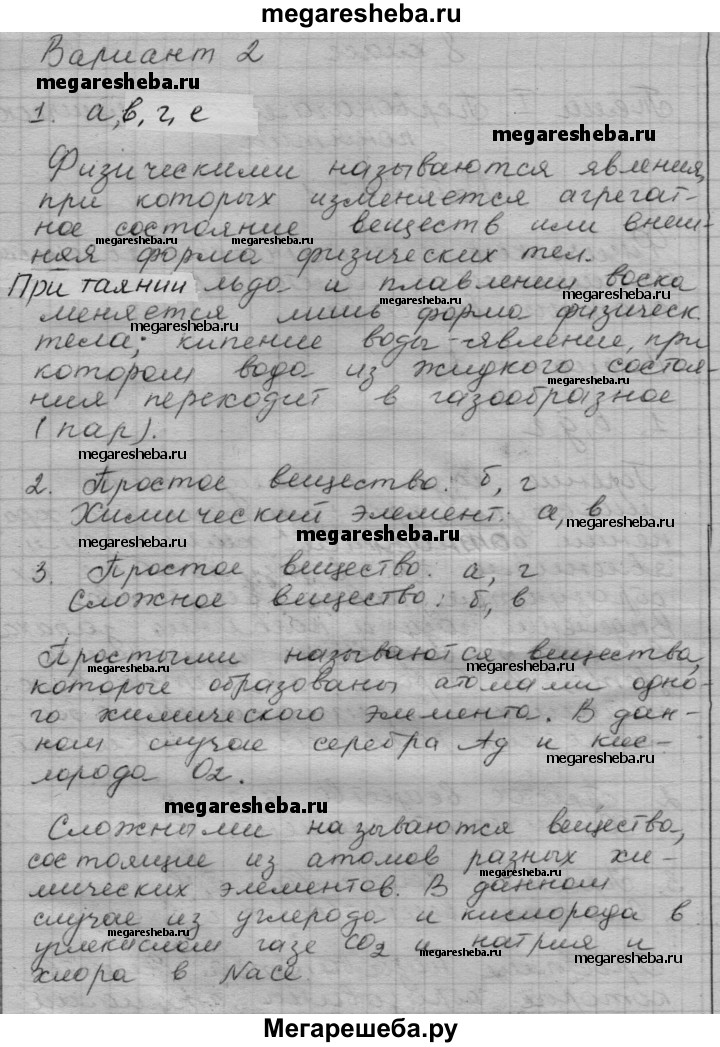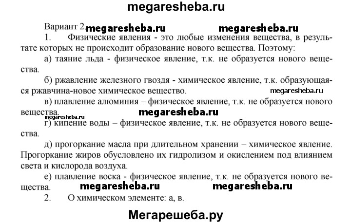 Вариант 2 1. Какие из перечисленных явлений относят к физическим и почему? а) Таяние льда; б) ржавление железного гвоздя; в) плавление алюминия; г) кипение воды; д) прогоркание масла при длительном хранении; е) плавление воска. 2. Укажите, в каких предложениях речь идет о простом веществе, а в каких — о химическом элементе. а) Водород входит в состав ядовитого газа сероводорода. б) Водород — самый легкий газ. в) На долю водорода в воде приходится 11%. г) Рыбы дышат кислородом, растворенным в воде. 3. Укажите, какие из перечисленных веществ являются простыми, а какие — сложными. Поясните свой выбор. а) Серебро Ag; б) углекислый газ СO2; в) поваренная соль NaCl; г) кислород O2.