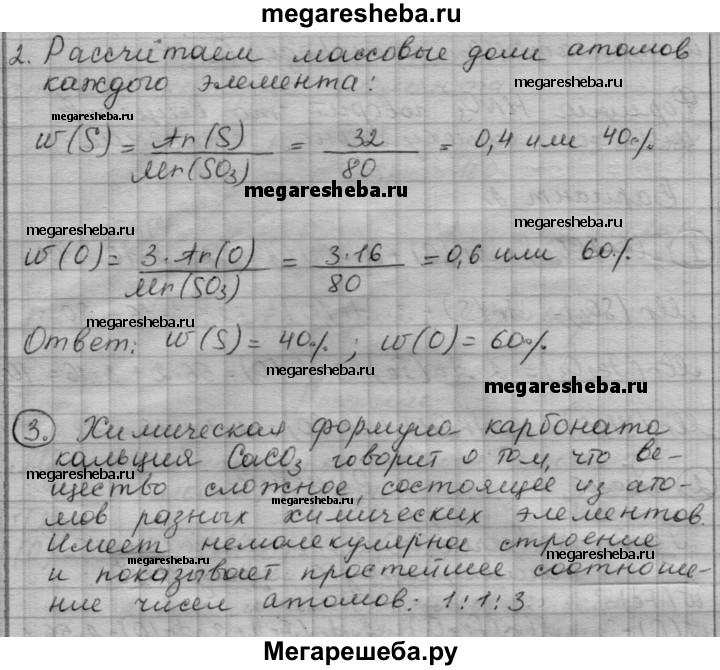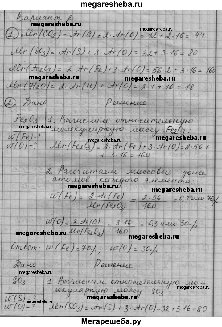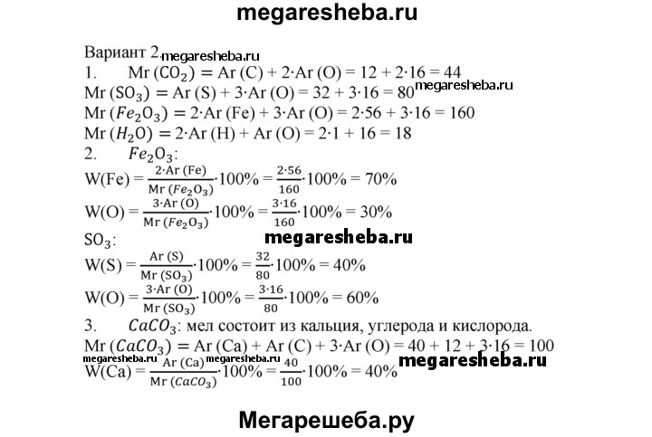 Вариант 2 1. Вычислите относительные молекулярные массы веществ: СO2, SO3, Fe2O3, Н2O. 2. Рассчитайте массовую долю каждого элемента в Fe2O3 и SO3. 3. Какую информацию о веществе несет его химическая формула — СаСO3 (карбонат кальция)?
