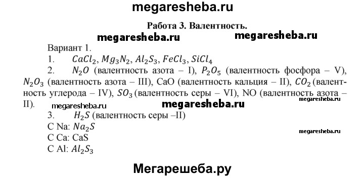 Вариант 1 1. Составьте формулы следующих соединений: CaxCly^l, MgxNy^lll, AIxSy^ll, Fex^lllCIy, SixCly^l. 2. Перепишите формулы и обозначьте римскими цифрами валентность элементов в соединениях с кислородом, зная, что в данных соединениях он двухвалентен: N2O, Р2O5, N2O3, CaO, СO2, SO3, NO. 3. Сера образует с водородом соединение H2S. Составьте формулы соединений серы с натрием, кальцием и алюминием, в которых сера проявляет такое же значение валентности, как в указанном соединении с водородом.