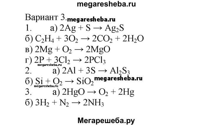 Вариант 3 1. Расставьте коэффициенты в схемах реакций. а) Ag + S —> Ag2S б) C2H4 + O2 —> СO2 + Н2O в) Mg + O2 —> MgO г) Р + СI2 —>РСI3 2. Составьте формулы веществ, образующихся в результате реакций, и расставьте в схемах реакций коэффициенты. а) АI + S^ll —>AIS б) Si + O2 —> SiO 3. Перепишите приведенные схемы реакций, вместо знаков вопроса напишите формулы соответствующих веществ и расставьте коэффициенты. a) HgO —> O2 + ? б) ? + N2 —> NH3