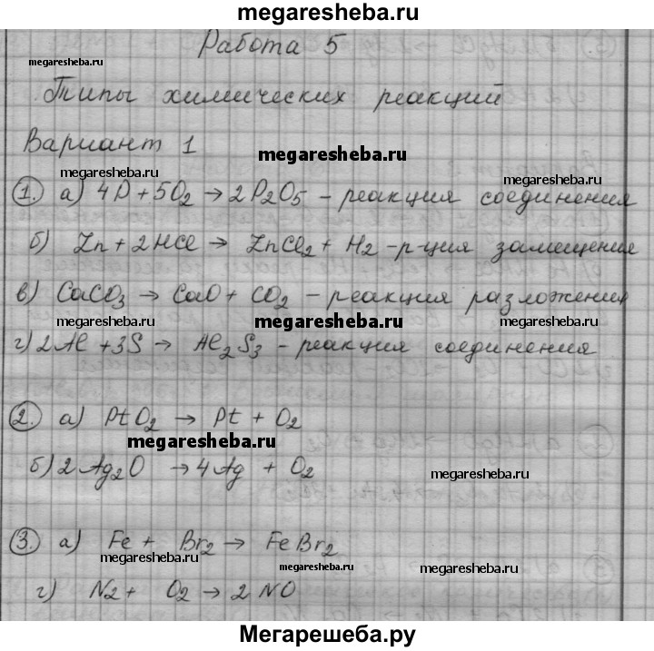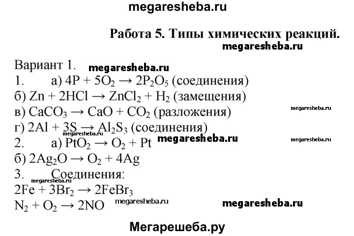 Вариант 1 1. Перепишите приведенные ниже схемы реакций, расставьте коэффициенты и укажите, к какому типу относится каждая из реакций. а) Р + O2 —> Р2O5 б) Zn + НСI —> ZnCl2 + Н2 в) СаСO3 —> СаО + СO2 г) AI + S —> AI2S3 2. Составьте уравнения реакций разложения: а) оксида платины РtO2; б) оксида серебра Ag2O. 3. Из приведенных схем реакций выпишите только те, которые относятся к реакциям соединения. Вместо знаков вопроса напишите формулы соответствующих веществ и расставьте коэффициенты. а) ? + Br2 —> FeBr2 б) Fe2O3 + Н2 —> Н2O + ? в) С6Н6 + ? —> СO2 + Н2O г) N2 + ? —> NO
