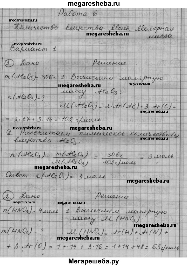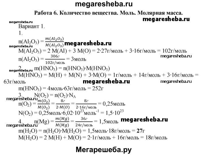 Вариант 1 1. Какое количество вещества соответствует 306 г оксида алюминия АI2О3? 2. Рассчитайте массу 4 моль азотной кислоты HNO3. 3. Сколько молекул содержится в 8 г молекулярного кислорода O2? 4. В какой массе воды содержится столько же молекул, сколько атомов в 36 г магния?
