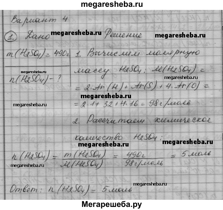 Вариант 4 1. Какое количество вещества соответствует 490 г серной кислоты H2SO4? 2. Рассчитайте массу 3,5 моль оксида цинка ZnO. 3. Сколько атомов содержится в 112 г железа? 4. Сколько граммов кислорода O2 необходимо взять, чтобы там содержалось столько молекул, сколько их содержится в 10 г водорода Н2?
