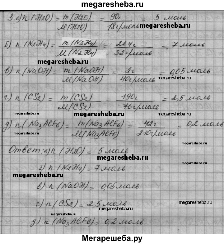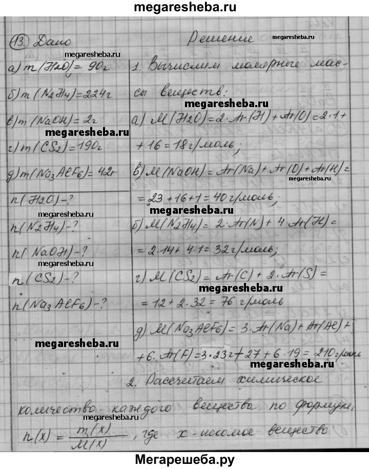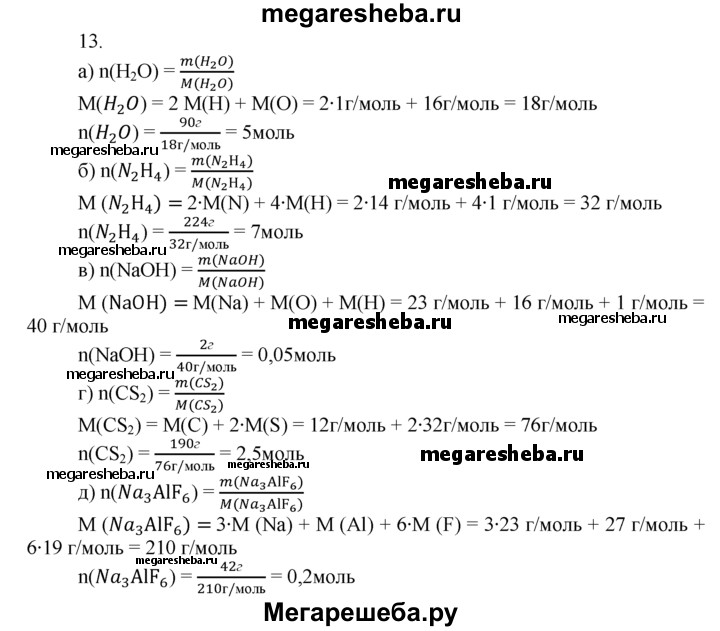 13. Какое количество вещества содержится: а) в 90 г воды; б) в 224 г гидразина N2H4; в) в 2 г гидроксида натрия NaOH; г) в 190 г сероуглерода CS2; д) в 42 г криолита Na3AlF6?