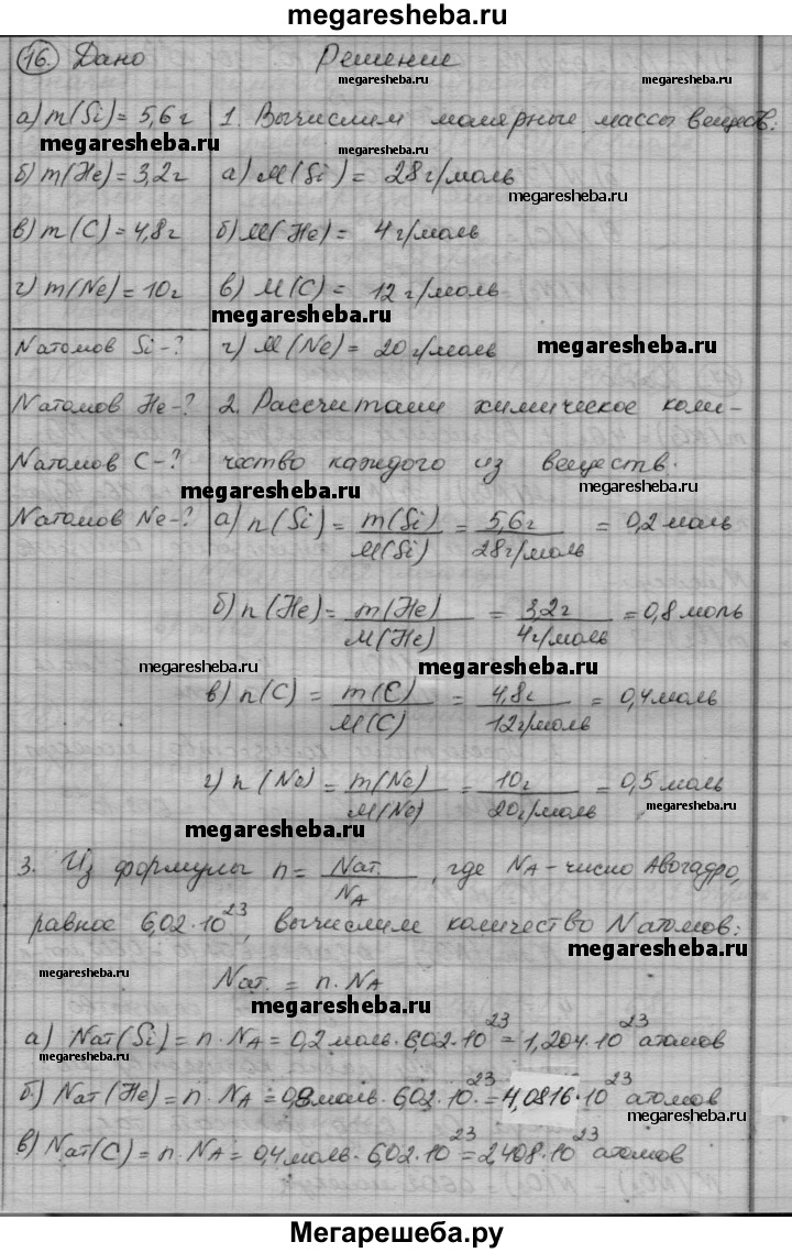 16. Сколько атомов содержится: а) в 5,6 г кремния; б) в 3,2 г гелия Не; в) в 4,8 г алмаза С; г) в 10 г неона Ne?